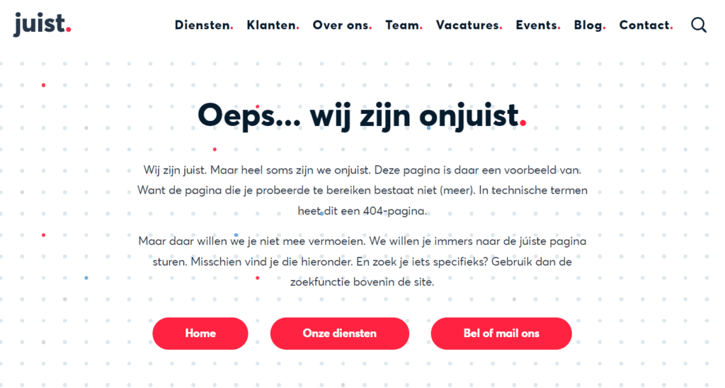 Sterker nog, als een gebruiker naar een 404-pagina wordt geleid, is de kans groot dat de klant je website afsluit. Controleer dus om de paar weken of al uw pagina’s in goede staat verkeren – en verwijder de 404-pagina’s.
