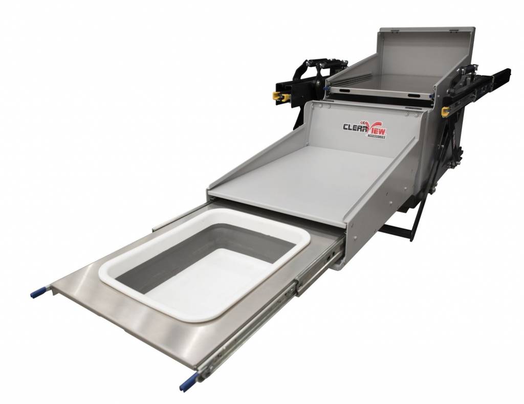 Het schuifplatform en de spoelbak (9L inklapbare siliconen spoelbak meegeleverd) zijn gemonteerd op 450mm schuifrails met een lock in/lock out functie. De 74 liter opslagruimte is toegankelijk via de toegangsdeur aan de voorzijde of via een opening aan de bovenzijde.