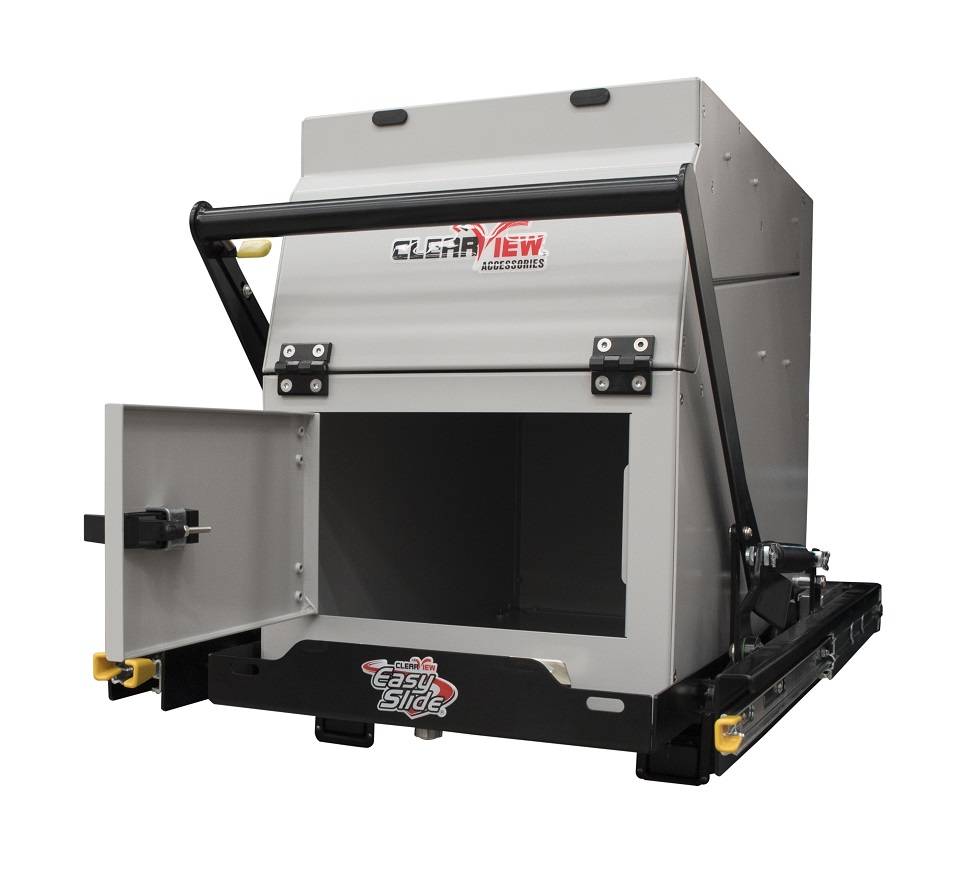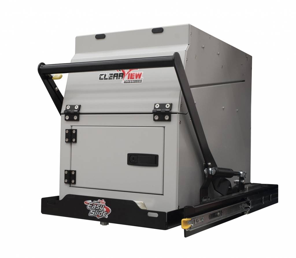 De unit wordt volledig gemonteerd geleverd en is ontworpen om te passen in de Clearview Easy Slide (ES-100) en Clearview Expanda Fridge Slide (apart verkrijgbaar en extra montagekit is nodig). Er wordt een garantie van 12 maanden gegeven op de bewegende delen.