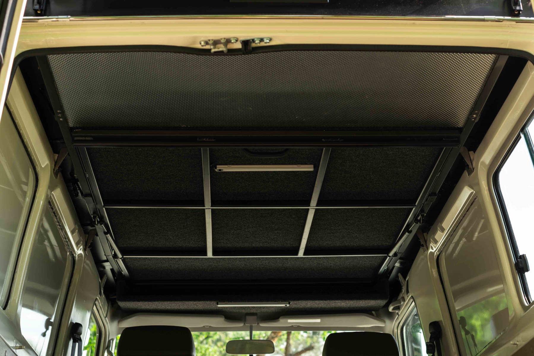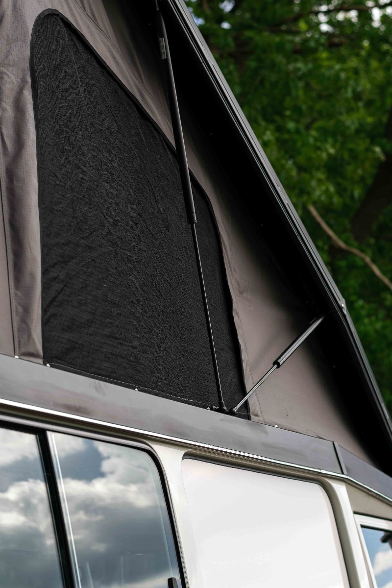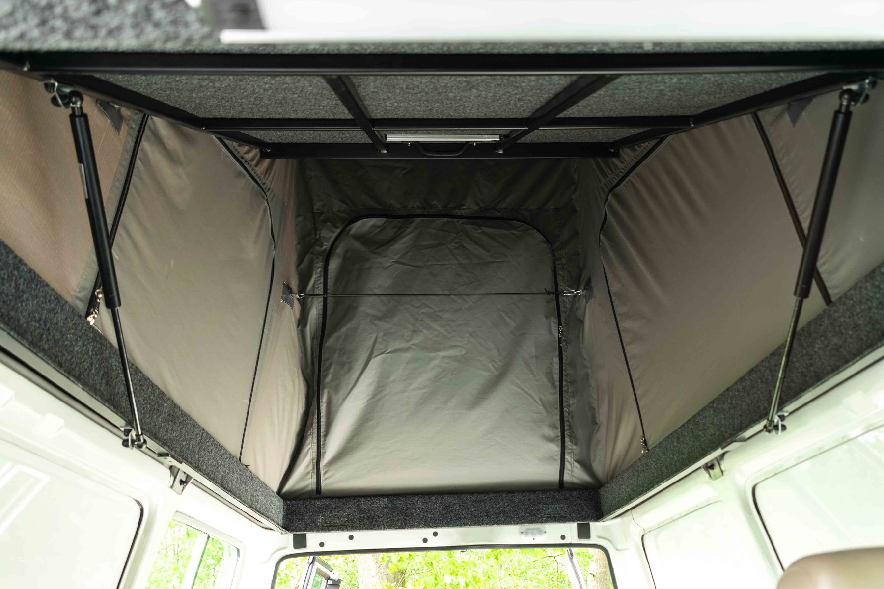 Vanuit de binnenkant kun je de ondergrond van het matras naar boven klappen door middel van gasveren. Terwijl de ondergrond naar boven geklapt is, kun je al uw bedgoed in de slaapruimte laten liggen. Door het openklappen van de ondergrond kun je rechtop staan in uw Toyota Land Cruiser HZJ 78.