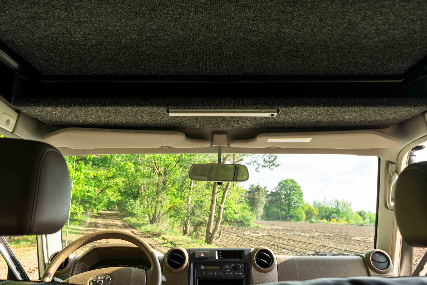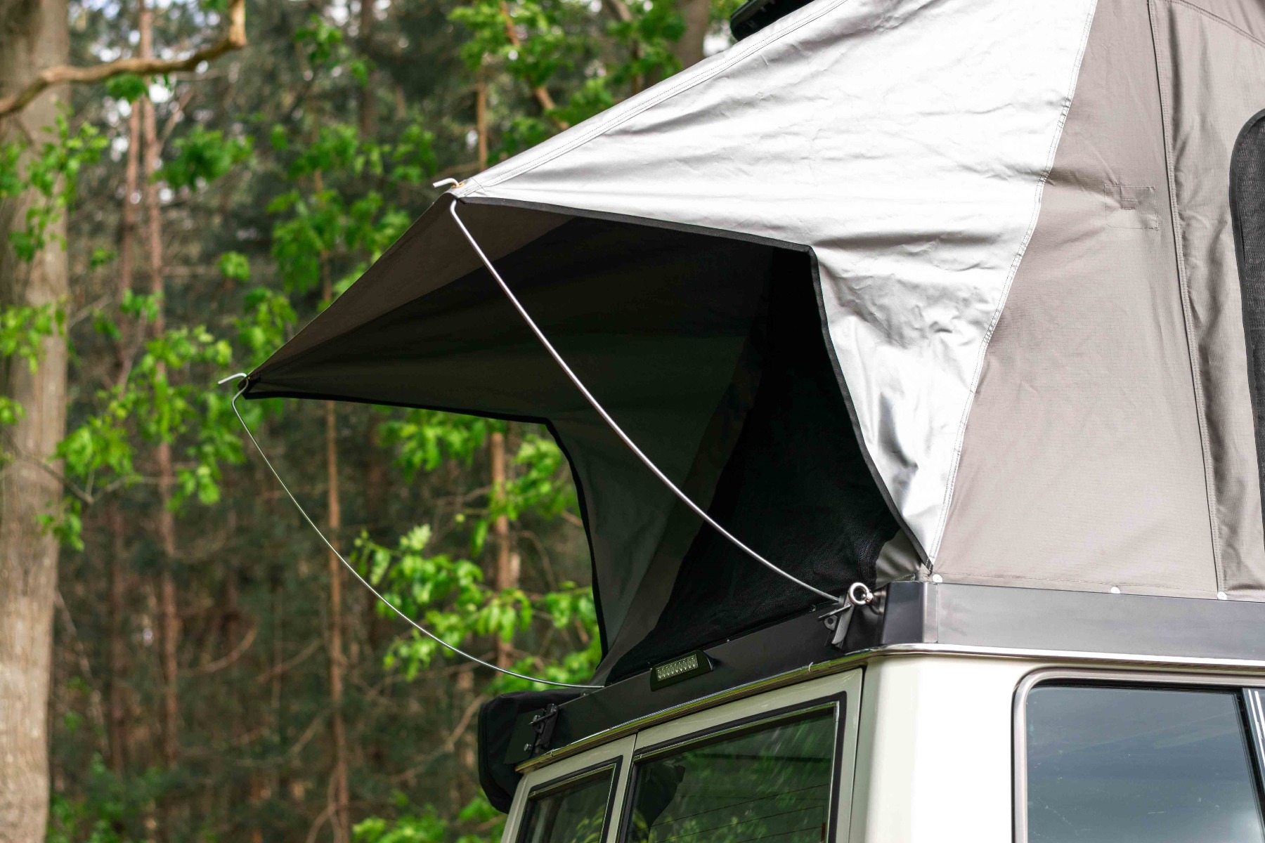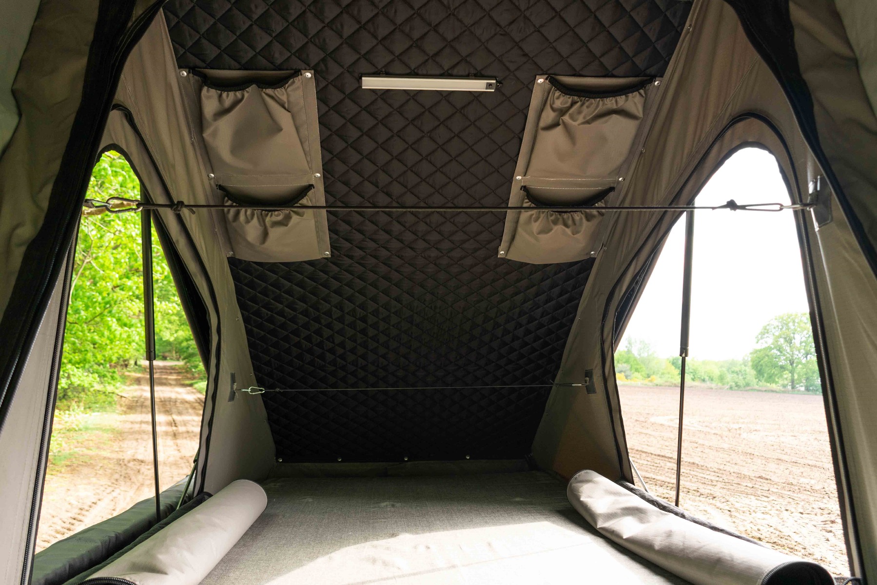Vanuit de binnenkant kun je de ondergrond van het matras naar boven klappen door middel van gasveren. Terwijl de ondergrond naar boven geklapt is, kun je al uw bedgoed in de slaapruimte laten liggen. Door het openklappen van de ondergrond kun je rechtop staan in uw Toyota Land Cruiser HZJ 78.