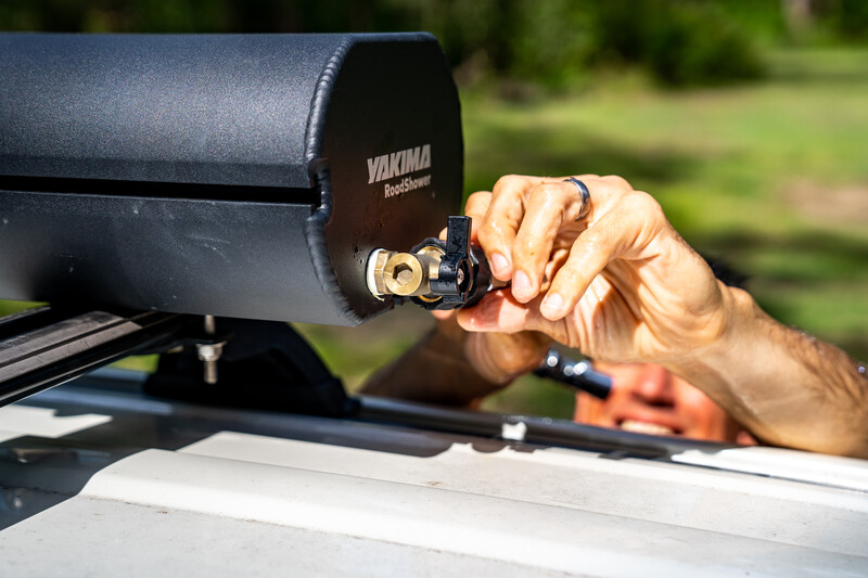 Furthermore, you can equip the Roadshower with a compressor which ensures that you can adjust the water pressure to rinse your belongings such as the dishes or your mountain bike, making the Roadshower multi-purpose. You can add water by means of the handy turning cap that is connected to a water tank with a capacity of 45.5liters. It is also possible to use a hot shower on cloudy days using a hot water boiler (not included).