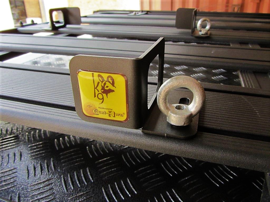 The Eezi-Awn K9 Store More Kit is designed to securely fasten square-shaped items easily, safely, and securely onto roof racks. The kit consists of four corner pieces, four tie-down rings, and a ratchet strap. The kit is suitable for all roof racks with a slot on the top side of the slats.
