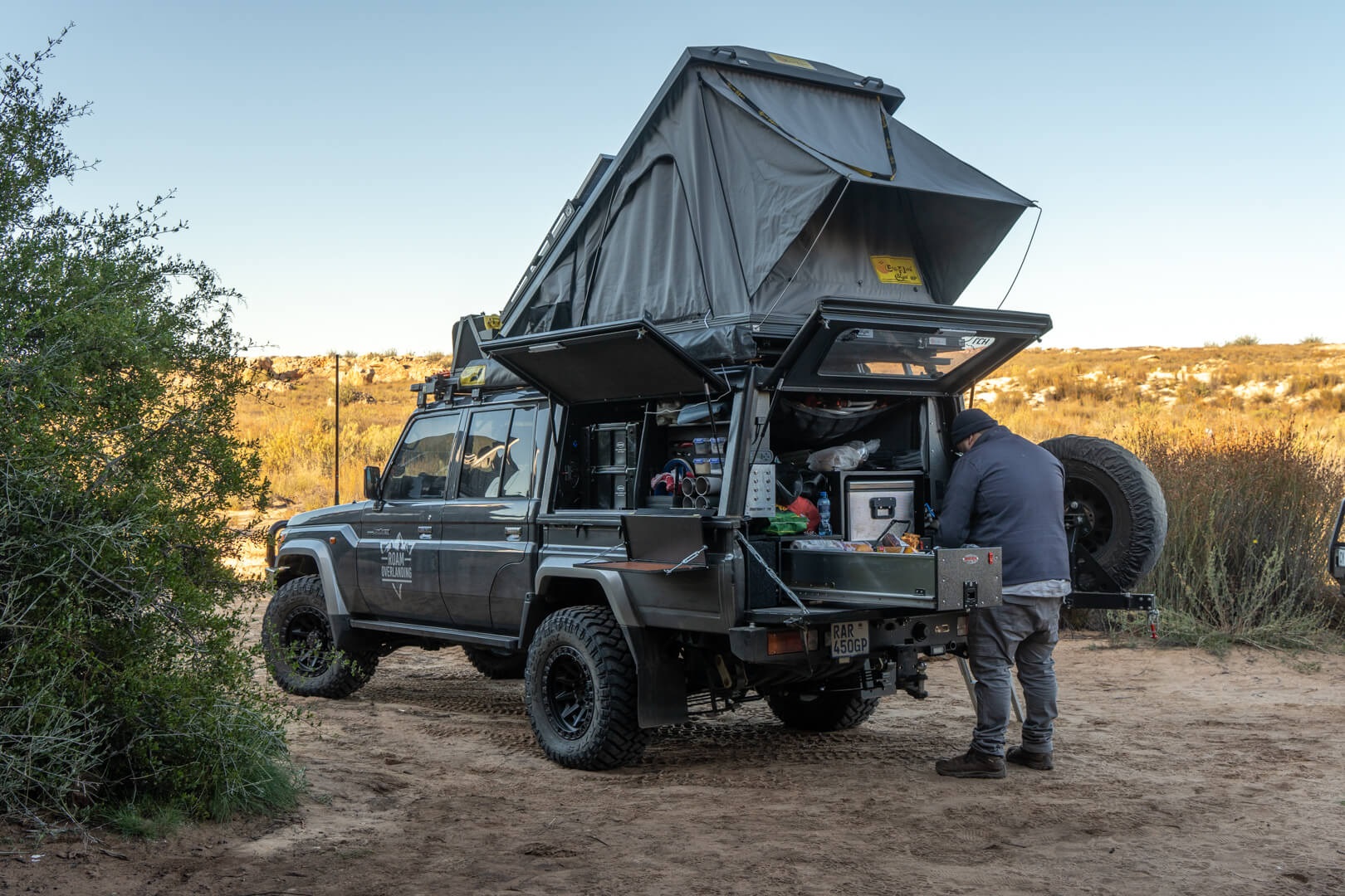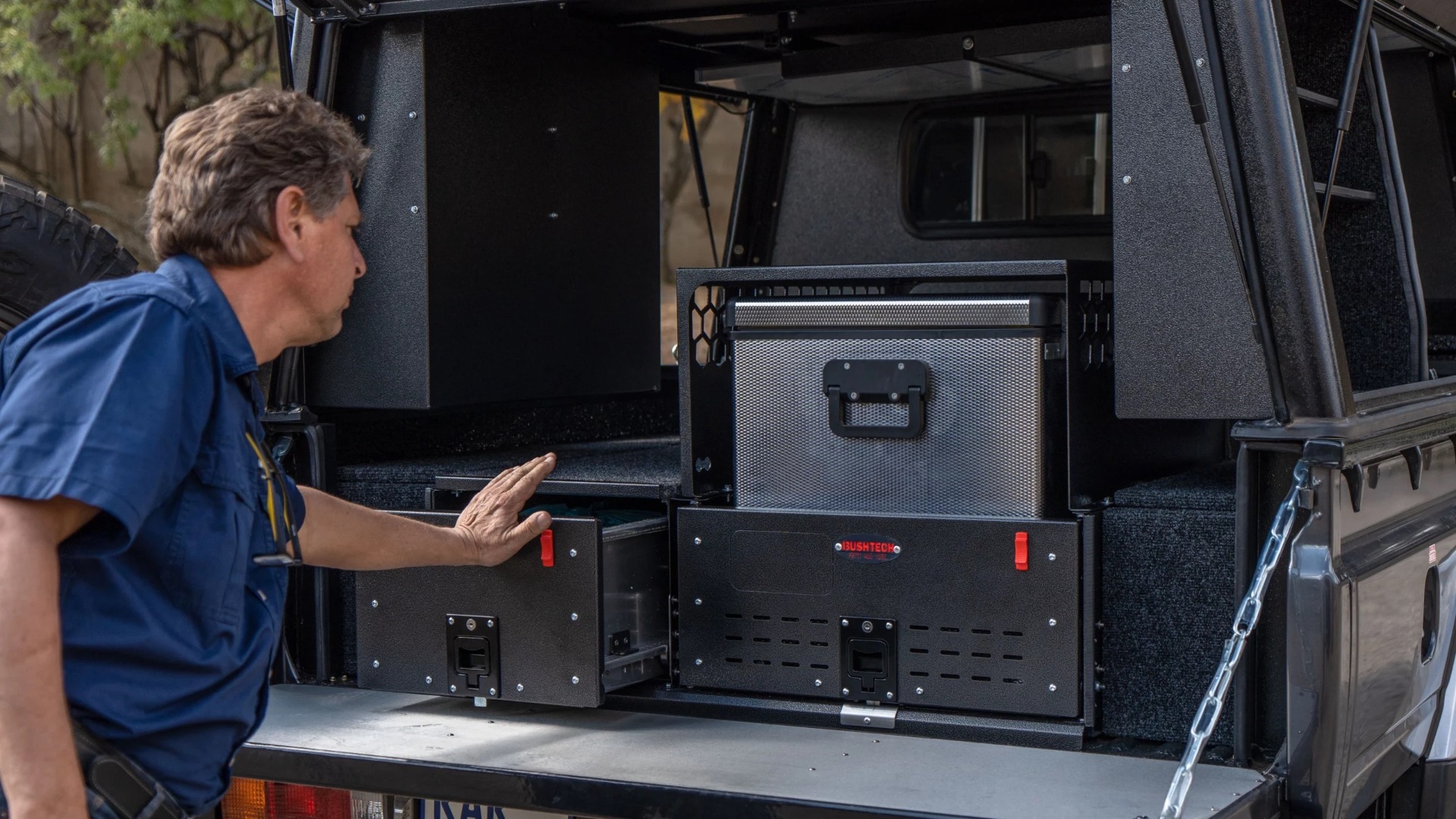 It is one of the only draw systems on the market that allows the fridge to be placed in the draw, allowing easy access to the fridge. The fridge draw can optionally be equipped with an energy chain that prevents the chances of the cable from being damaged when sliding the draw in and out. Working with fridge manufacturers, Bushtech has allocated adequate spacing and slots for ventilation. Their unique modular system allows a board to be placed on the fridge draw deck, providing a flat packing space when the fridge is removed.