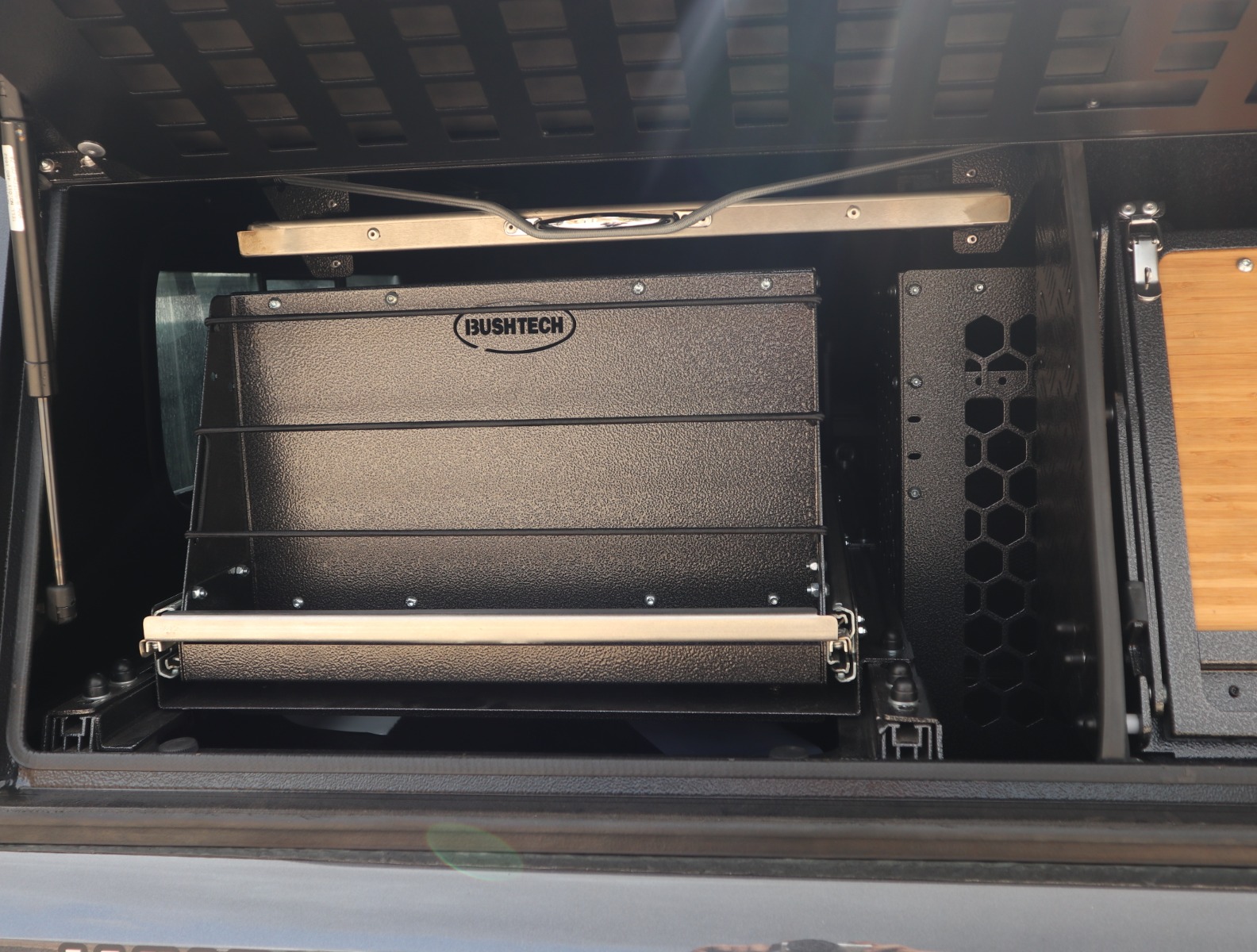The Bushtech Canopy Pantry can be mounted on the Bushtech Ammobox holder, providing a convenient and space-saving storage solution. With telescopic ball-bearing slides, the Pantry easily slides out through the side door, allowing easy access outside the canopy. Made from powder-coated aluminum, it offers a strong yet lightweight construction. The Pantry is ideal for storing cookware, utensils, and food supplies. It features various straps to prevent items from falling out while driving, making it a practical addition to your Bushtech Canopy.