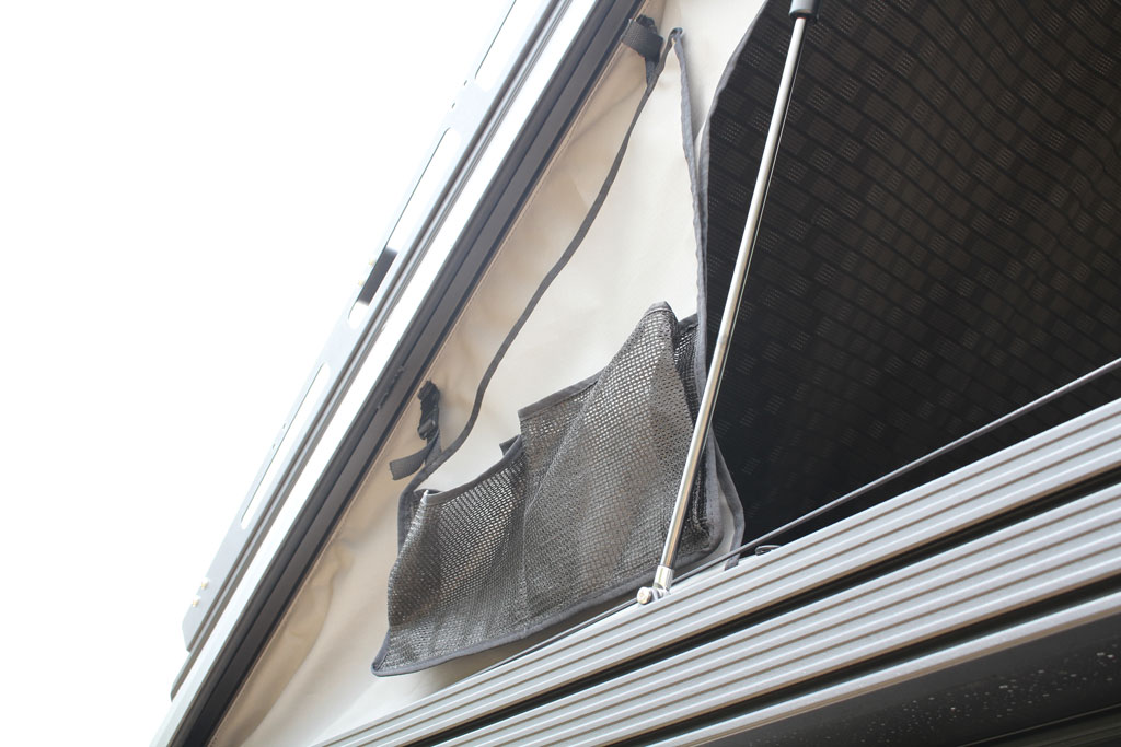 The K9 rack system is now standard on top of the tent’s lid, making it very easy to mount various K9 accessories such as axe/spade holders or K9 load bars. On the load bars, you can attach items like a solar panel, bikes, or kayaks, to name a few. The maximum load during driving is an acceptable 50kg; however, this needs to be reduced to a maximum of 30kg if you want to open the tent.