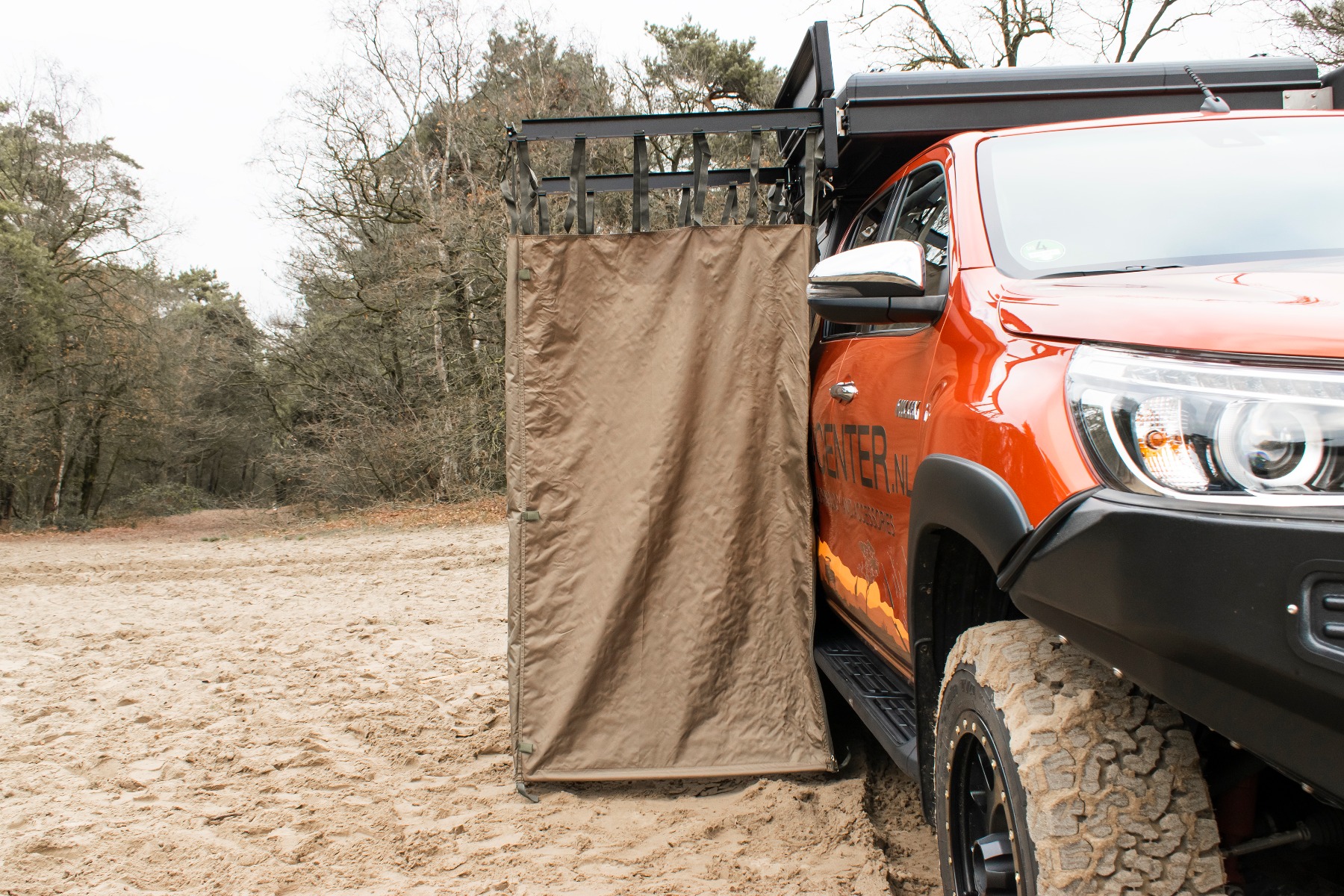The canvas used for the shower curtain is silver-coloured on the inside to maximize light reflection. As a result, it feels like a more spacious and bright area, and the material dries quickly. The outside is safari green and does not unnecessarily stand out when you’re camping in nature.